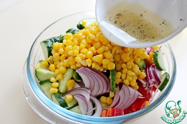 Выложить все овощи в салатник, добавить консервированную кукурузу.