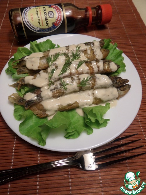 Подаем мойву с зеленью и соево-сметанным соусом.