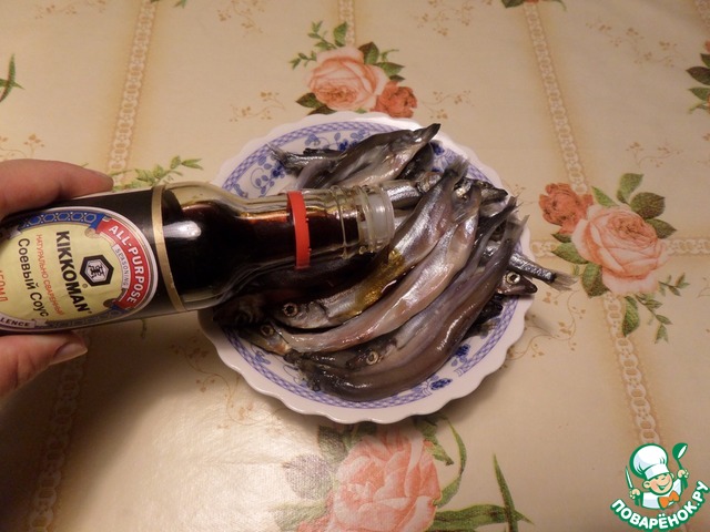 Мойку промываем. Кладем в чашку. Добавляем 2 ст. л. любимого соевого соуса ТМ "Kikkoman". Оставляем на 20 минут.