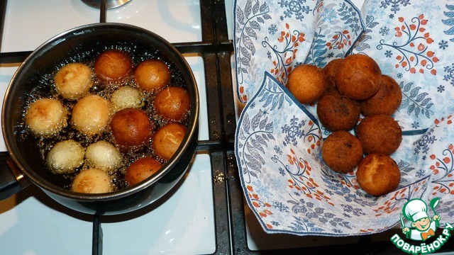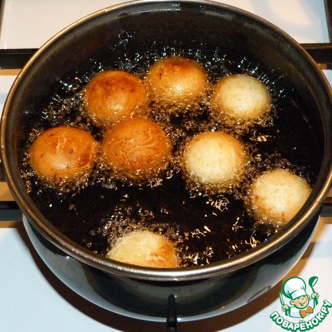 Налейте масло в сотейник (или кастрюлю) слоем около 3 см и поставьте на огонь. Температура масла должна быть около 140° С (если бросить маленький кусочек теста, то он начнёт медленно всплывать). Важно не перегреть масло! Немного убавьте огонь. Смажьте руки капелькой масла и отщипните кусочек теста размером с грецкий орех или чуть больше. Скатайте шарик и опустите в масло. Сделайте столько шариков чтобы в сотейнике еще осталось достаточно места, так как андаги увеличатся в объёме. Я делаю несколько шариков и потом их выкладываю в масло один за другим.