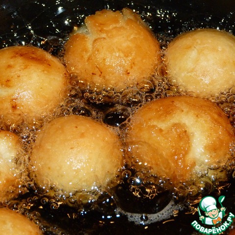 Немного пошевелити шарики лопаткой чтобы они отстали ото дна. Дальше они будут вертеться сами, наша помощь им почти не понадобится. Жарить пончики нужно на среднем огне минут 7-9, до золотистого цвета.