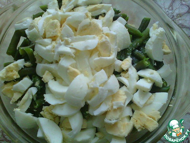 Переложить фасоль в салатник, сверху выдавить чеснок через пресс и добавить крупно порезанные яйца.