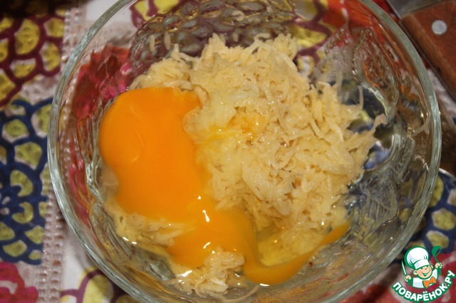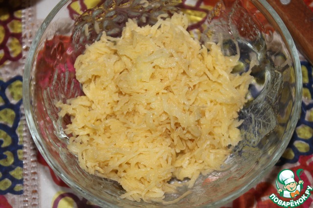 Картошку трем на мелкой терке. Выжимаем из нее сок.