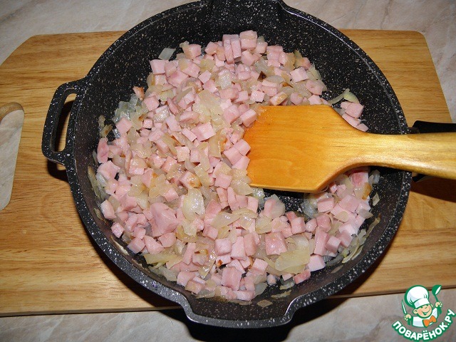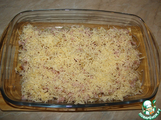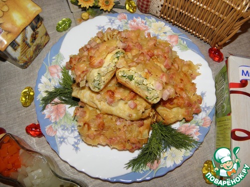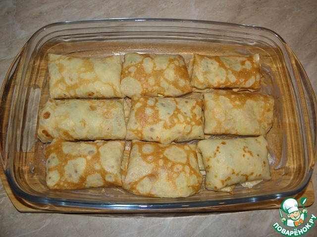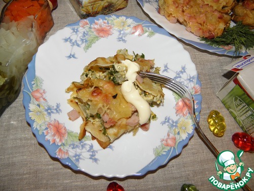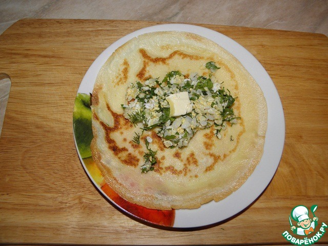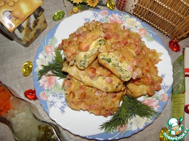 1)Испечь блины по любимому рецепту. 2) для внутренней начинки отварить рис, яйца. 3) Яйца натереть на мелкой терке, зелень мелко нарезать, добавить рис, все перемешать, соль, перец по вкусу. 4) Выкладывать начинку на блин, в середину кусочек сливочного масла, свернуть конвертиком. 5) Форму смазать слив. маслом, уложить блины. 5) Для верха: ветчину нарезать кубиком, лук мелко нарезать, обжарить их на сковороде в последовательности лук-ветчина, и выложить на блины. 6) Сыр натереть на мелкой терке, и хорошо посыпать верх. 7) Разогреть духовку 180%, и поставить минут на 25, до золотого цвета.