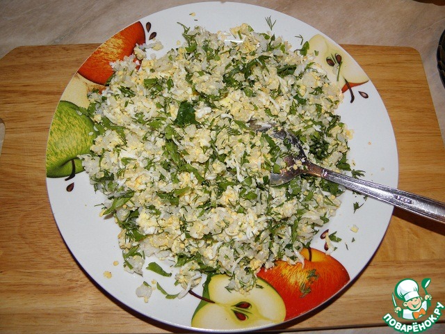 Натерла яйца, зелень тоже на совесть мелко нарубила!