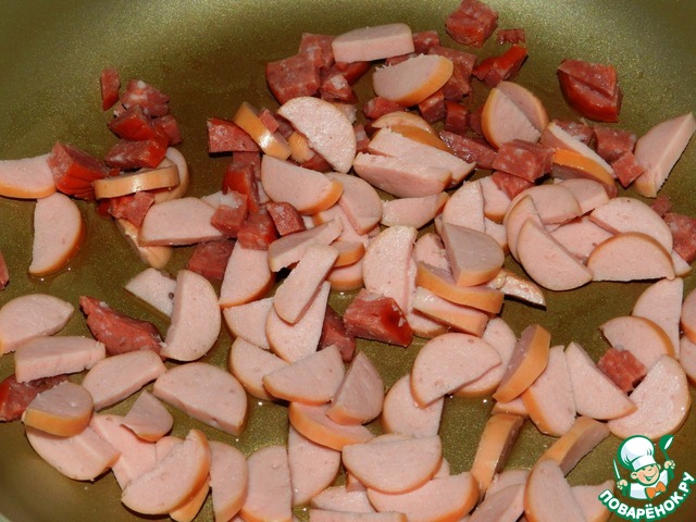 Сосиски и колбасу порезать, обжарить на сковороде в небольшом количестве масла. Тем временем сразу вскипятить подсоленную воду для спагетти и отварить их.