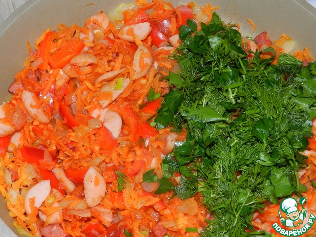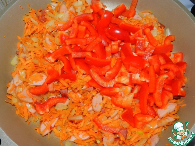 Морковь очистить, натереть на крупной тёрке. Лук очистить, мелко порезать. Лук и морковь добавить к колбасе и мясу, обжарить. Болгарский перец вымыть, очистить, нарезать брусочками, отправить в сковороду. Поперчить, перемешать, немного всё вместе обжарить.