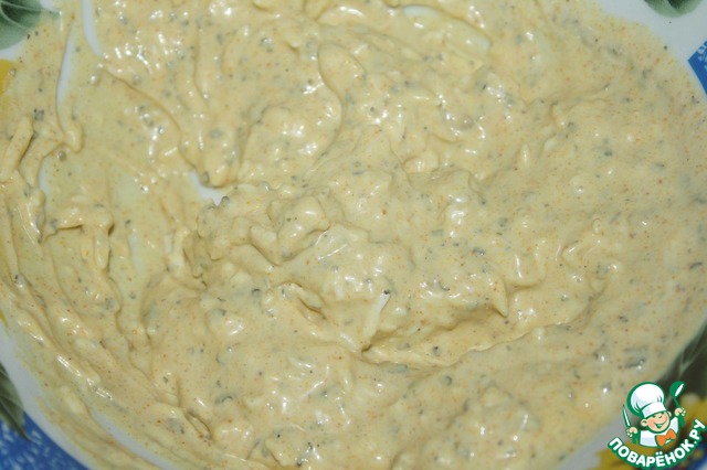 в миске смешать майонез (у меня был легкий 30%),1 ч. л. горчицы, базилик сушеный, кориандр, куркуму, перец черный крупного помола и натертый на мелкую терку половинку плавленного сыра (солить не нужно)