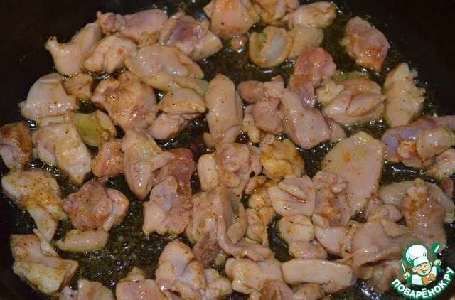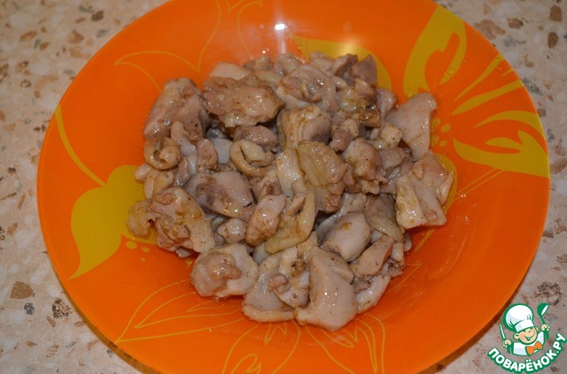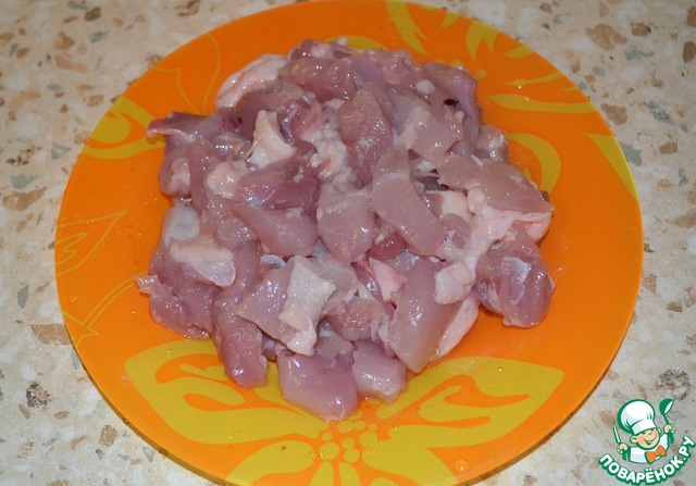 Куриное мяско нарезать небольшими кусочками.