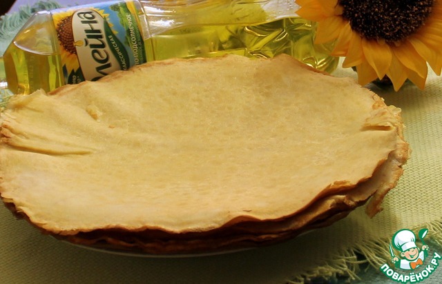 Готовим блины. Смешиваем молоко, яйца и соль. Добавляем муку и перемешиваем до однородности. Затем добавляем масло и вмешиваем в тесто. Ставим в холодильник минимум на 30 минут. Затем выпекаем блины, смазывая сковороду при необходимости подсолнечным маслом.