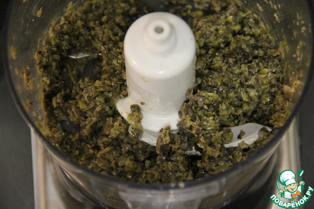 Для соуса тапенда измельчаем каперсы, черные оливки, анчоусы, лимонный сок и подсолнечное масло ТМ "Олейна" с помощью кухонного комбайна.