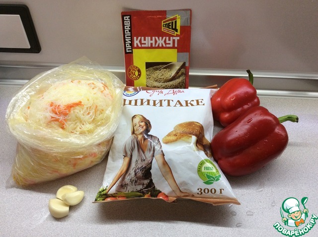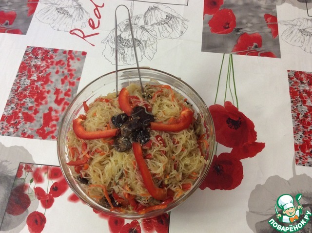 Пока тушится перец с грибами, измельчаете чеснок и отправляете его на сковороду. Перемешиваете. Выкладываете фунчозу, добавляете соевый соус и кунжут. Выключаете плиту и постоянно помешивая, доводите салат до готовности ещё минут 5. Я беру готовую фунчозу, а она уже с подсолнечным маслом, поэтому дополнительной заправки не требуется. Если кто-то любит сильно солёно, то досолите, мне хватает соли.