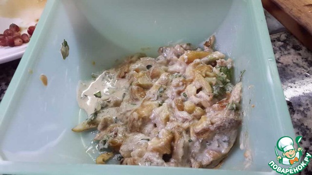 Если вдруг остался баклажан с тхиной (если вы на пикнике, он не останется, сколько не сделаешь, но чисто гипотетически), отделить мякоть от шкурки, порубить ножом прямо в тарелке/миске.