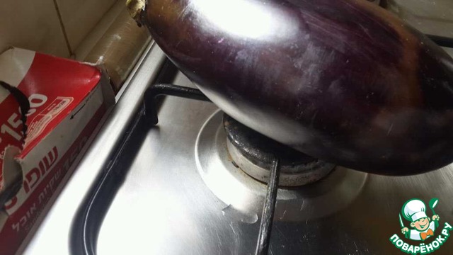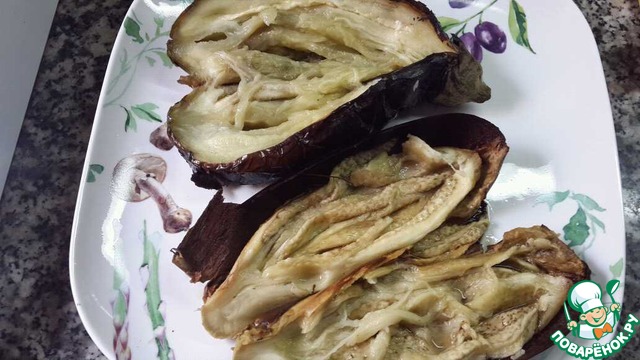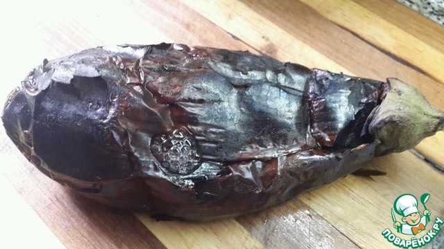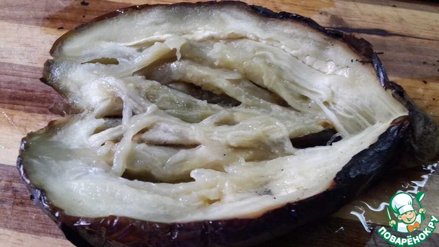 1 - положить баклажан в огнеупорную форму и запечь в духовке, при 200°С нагреве, минут 30.