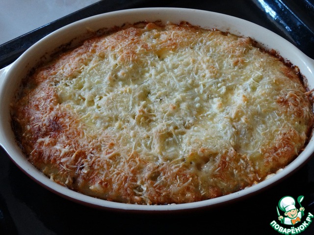 Ставим форму в предварительно разогретую духовку на 35- 40 минут, при температуре 200 градусов. Ориентируйтесь по своей духовке и на индивидуальность своей формы, если сыр зарумянился, а блюдо еще не готово, прикройте верх фольгой или смоченной водой бумагой. Моя керамическая форма используется впервые, тест-драйв, как бы. Поэтому, пришлось накрыть фольгой и поставить еще минут на 10. А запах!.. На пороге сидят уже три соседские кошки :)