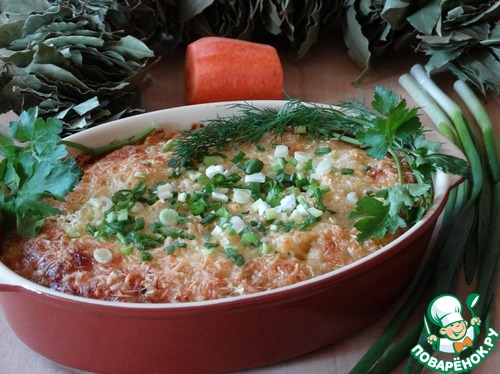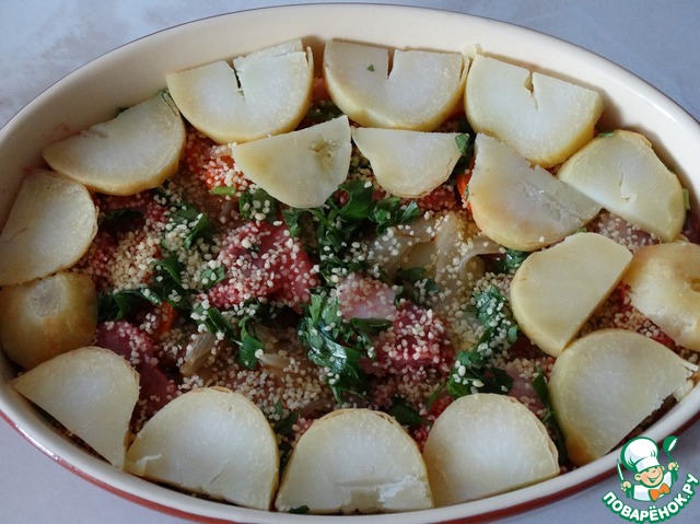 В форму, слегка смазанную маслом, в котором обжаривали овощи, выкладываем слоями картофель кружочками-кусочками ( 1/3 часть), лук и морковь- половина, посыпаем кус-кусом. На рыбалке, конечно, обходимся без него, в ход идет обыкновенная манка. Для рыбалки манка нужная вещь, рыбаки знают!