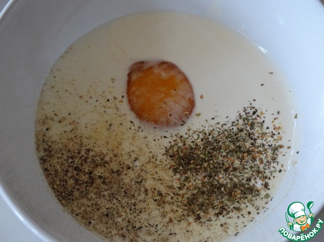 Для заливки смешиваем в миске яйцо, сливки, молоко, соль и пряные травы. Упоминать бренды, по условиям конкурса нельзя, так что сами выбирайте, на свой вкус. Не забываем перец - мне нравится смесь белого и черного. Взбалтываем все вилкой и аккуратно заливаем нашу запеканку.