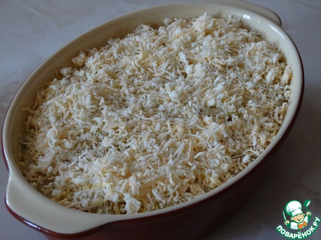 Сверху щедро засыпаем тертый сыр. У меня в морозилке всегда есть такой запас натертого сыра, который регулярно пополняю, а он все исчезает и исчезает.