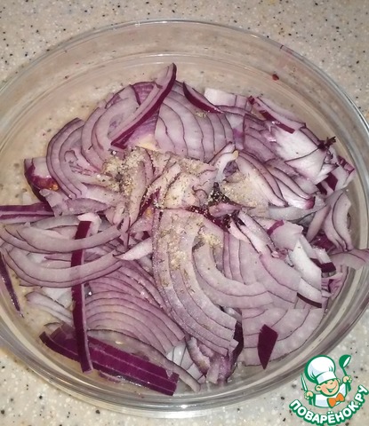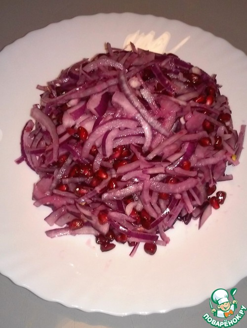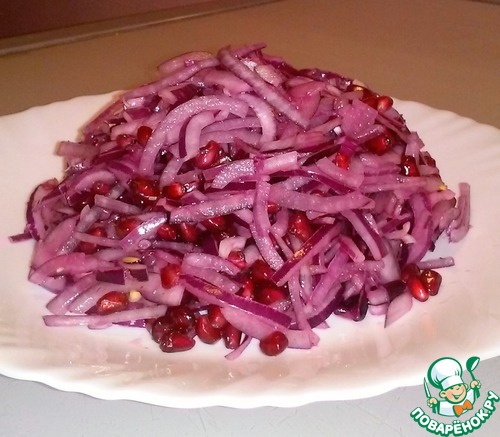 Лук нарезать тонкими кольцами или полукольцами кому как нравится, добавляем его к гранату. Немного солим, затем руками перемешиваем салат, немного примять лук с гранатом.