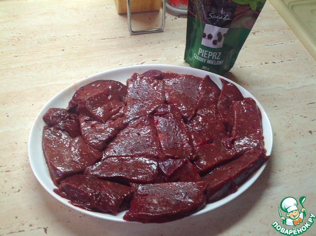 Печень вымыть зачистить от плёнок и протоков. Чем меньше всяких ненужностей, тем мягче получается печень. Нарезать довольно крупными кусками, но не очень толстыми, примерно 0,7-0,8 см. Посолить и поперчить, тут уж как любите.