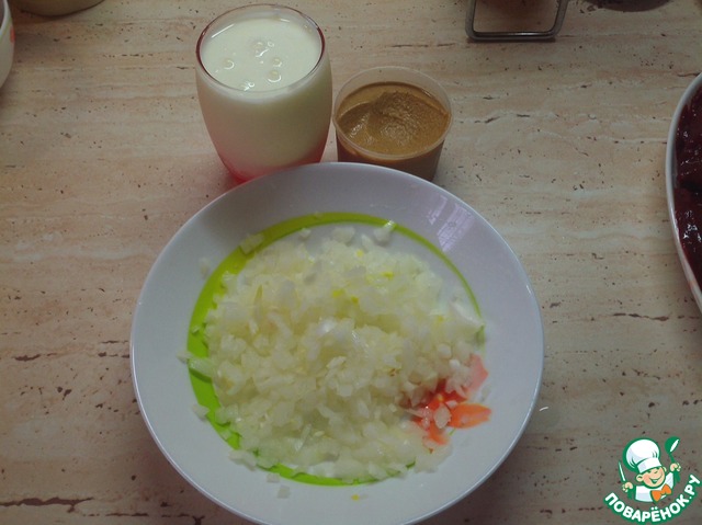 Теперь займемся маринадом. Лук (лучше белый - он более сочный) нарезать как можно мельче, чуть посолить и помять руками, чтобы он отдал нам больше сока. В глубокую посудину вылить кефир (лучше жирный - он гуще), добавить лук и горчицу.