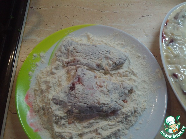 Приступаем к жарке. Сковороду с маслом хорошо раскалили, муку просеяли в большую тарелку. И вот теперь печень ОБИЛЬНО обмакиваем в маринад, в муку и на сковородочку. Когда вся сковорода заполнена, уменьшаю пламя и накрываю крышкой. Обжаривать конечно же с двух сторон.