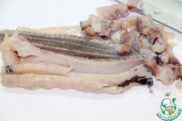 Пока варится крупа, почистить селедку, филетировать ее, обескосточить и нарезать мелкими кубиками. Селедки понадобится столько же, сколько и киноа.