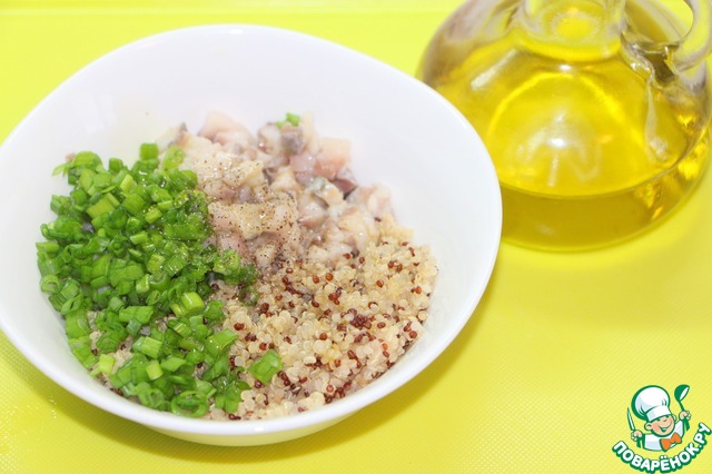 Смешать равное количество киноа и селедки, добавить мелко рубленный зеленый лук, оливковое масло и щедро поперчить. Перемешать.