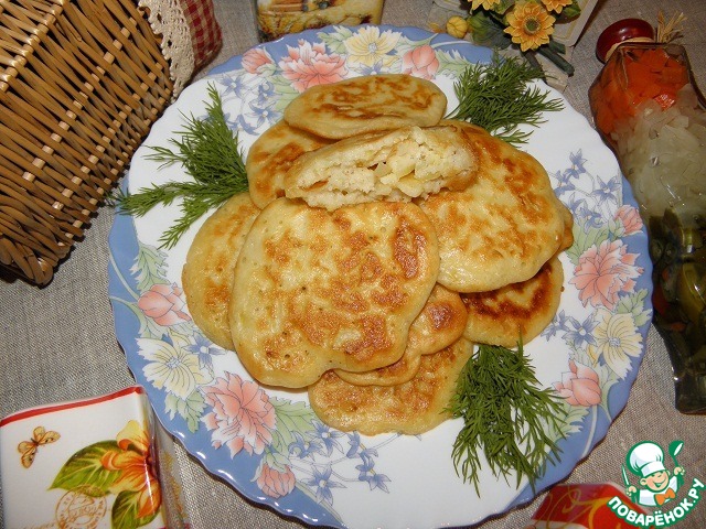 Как можно мельче нарезать капусту ( 2 стакана), чуть посолить и помять руками, чтобы она дала немного сока.