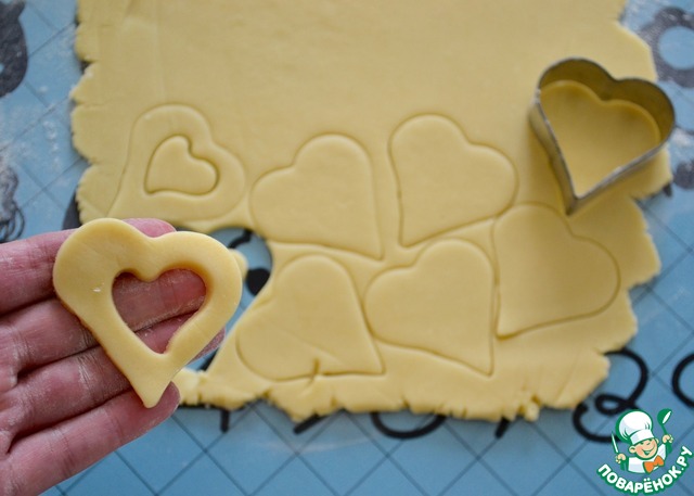 Тесто выложить на рабочую поверхность и раскатать в пласт толщиной 4-5 мм, не очень тонко. А теперь из теста соответствующими формочками вырезать печенье любой формы! По вашему желанию... Формочками более маленького размера вырезать у каждого печенья серединку.