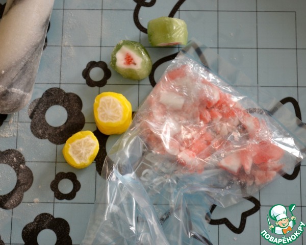 Выложить нарезанное таким образом печенье на противень, застеленный пекарской бумагой (обязательно!). Уточняю, для приготовления печенья используем самые обыкновенные цветные леденцы! Конфеты разобрать по цвету и положив в пакет слегка побить тяжелым предметом, чтобы разбить их на кусочки.