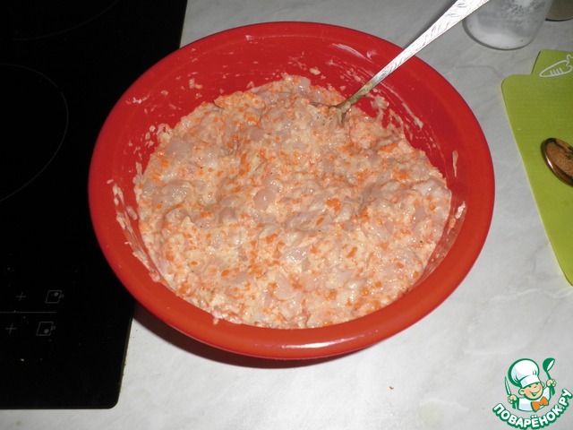 Смешиваем рубленое филе, картофель, измельченные овощи. Добавляем 2 яйца, сметану, соль и перец.