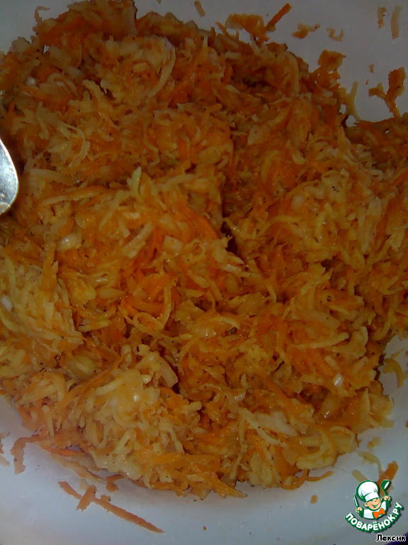 Натираем на мелкой терке морковку, картошку, лук режем мелко-мелко, все перемешиваем, солим