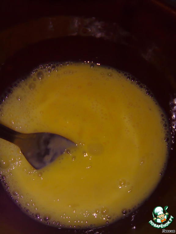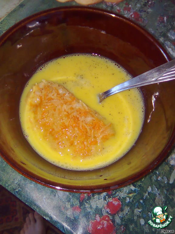 Яйца взбиваем хорошенько (я добавляла немного водички), солим, перчим