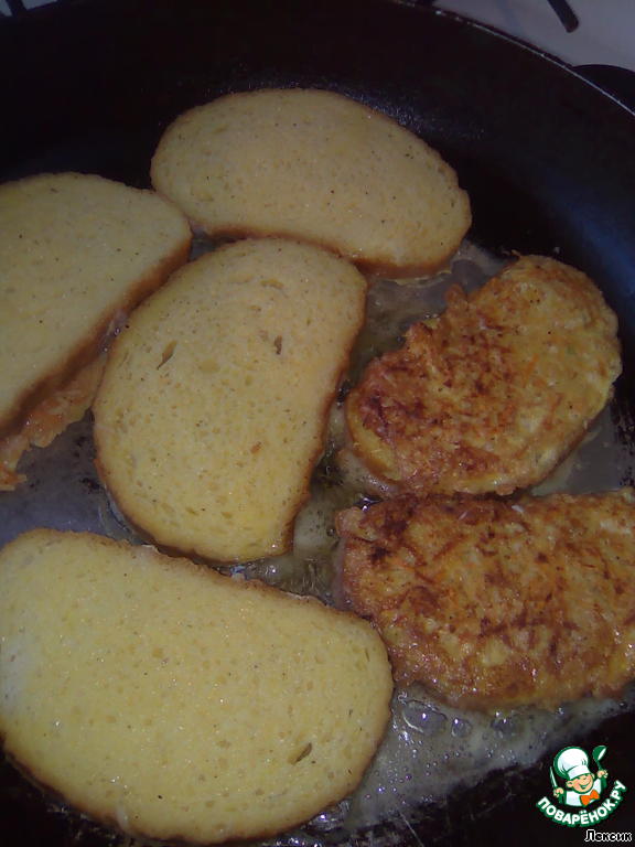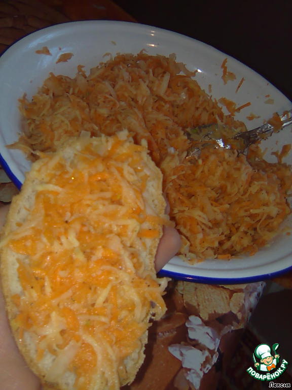 На кусочек батона выкладываем смесь из картошки, морковки и лука