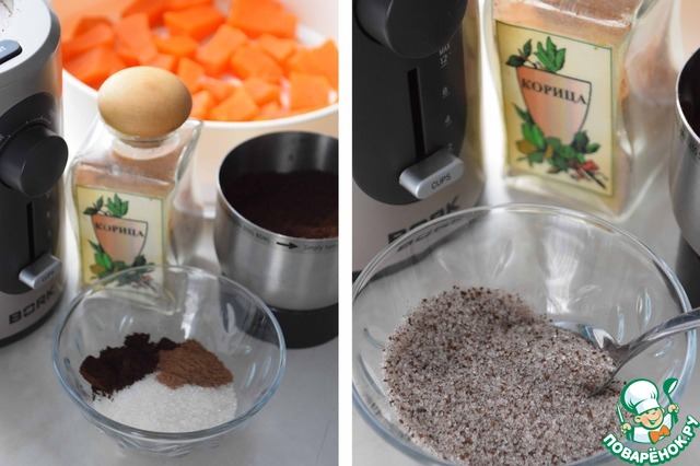 Тыкву порезать кубиками и запечь (или отварить на пару) до готовности. Я готовила в МВ в режиме "Варка на пару" в течение 30 минут. Остудить.