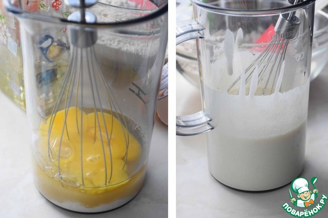В емкость разбить яйца, добавить сахар и хорошо взбить массу (до увеличения в объеме в 2 раза)