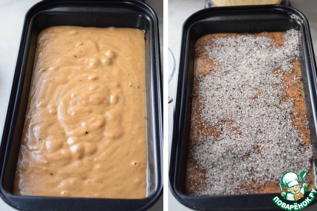 Выложить тесто в смазанную маслом форму (11 х 21 см), сверху посыпать посыпкой. Выпекать в предварительно разогретой до 180°С духовке 55 минут. Ориентируйтесь по Вашей духовке.