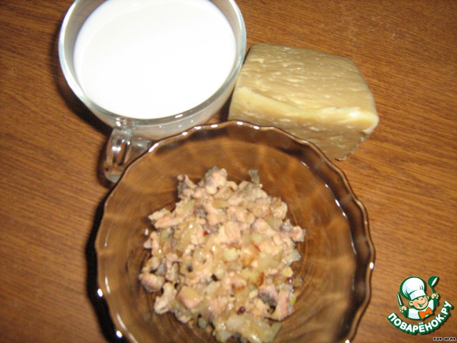 Красная рыба(я использовала тешу) - 60 г, обжариваем с луком - 25 г, заливаем жирными сливками - 30 г, доводим до загустения, солим, перчим. Сыр - 10 г (сыр нетираем перед запеканием).