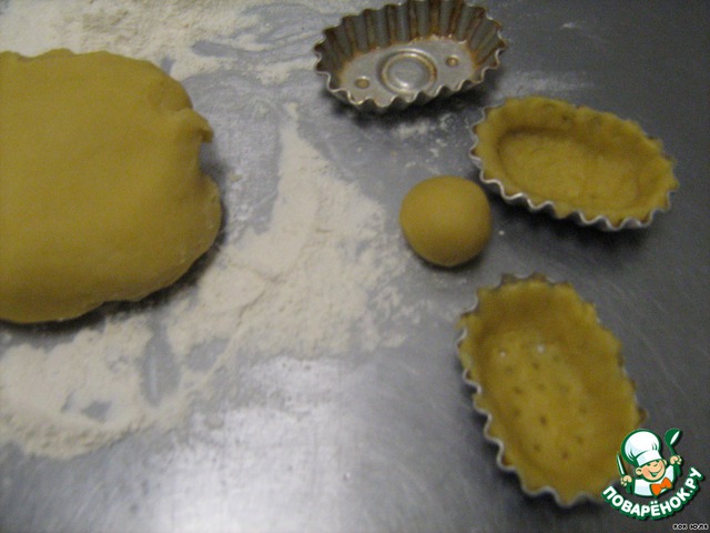 Готовое тесто делим на шарики, которые размазываем тонким слоем по тарталетке, предварительно смазанной маслом.