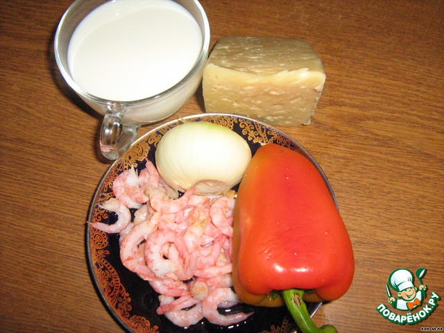 Лук - 25 г - обжариваем с перцем болгарским - 30 г, добавить креветки - 40 г, заливаем жирными сливками - 30 г, доводим до загустения, солим, перчим.(Можно добавить ананас, у меня не было). Сыр - 10 г(сыр натираем перед запеканием).