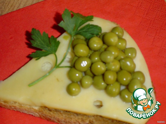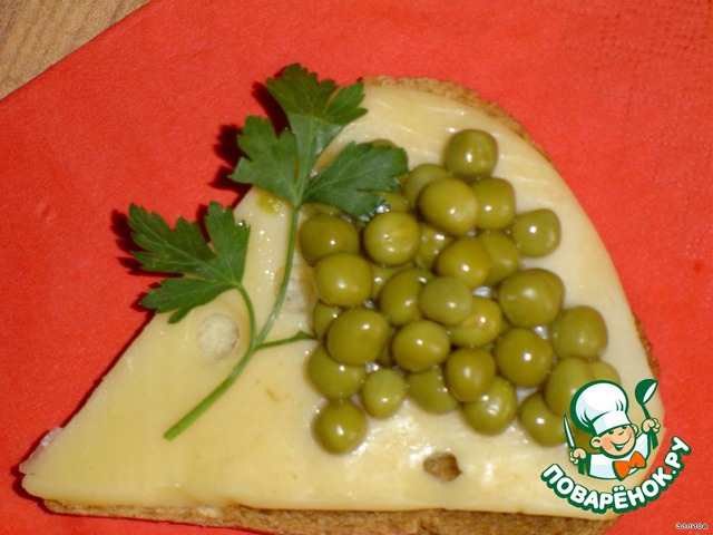 Выкладываем на бутерброд консервированный зеленый горошек в форме виноградной грозди.