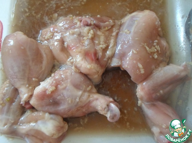 В не глубокую форму для запекания выкладываем курицу. Добавляем соль, сахар, соевый соус, кориандр, Кока-Колу (0,5 банки, если хотите много соуса, либо у вас много курицы, смело выливайте всю), чеснок пропущенный через чеснокодавку.