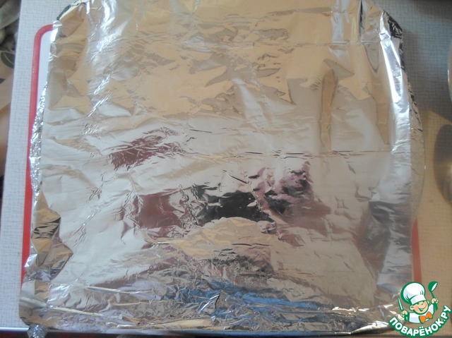 Закрываем форму фольгой и сразу же отправляем запекаться, в предварительно разогретую духовку, на 1 час при температуре 180 градусов.