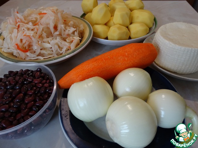 Так как дети любят вареники с картошкой и луком, я с фасолью, а муж - грузинский вариант "квари" - с сыром, а заодно и с квашенной капустой, решила выбрать следующие продукты: