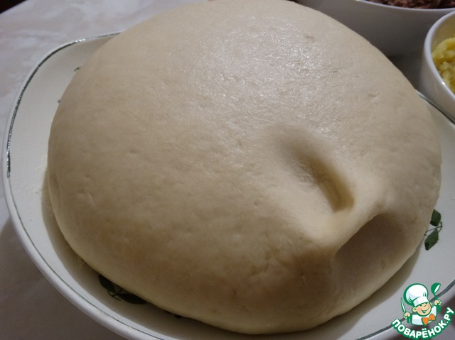 Тесто для вареников готовим заварным способом. Для этого муку в количестве 3 стаканов насыпаем горкой в большую миску, предварительно просеяв. Добавляем 3 ст. л растительного масла и соль, сверху частями льем кипяток, замешивая тесто. Заварное тесто тщательно вымешиваем ложкой. Когда оно немного остынет, добавляем по одному яйца, продолжая перемешивать. Затем в тесто добавляем муку, и как только оно станет более плотным, выкладываем на стол с мукой, вымешиваем до гладкости. Помещаем тесто в полиэтиленовый пакет, выдерживаем 1 час при комнатной температуре.