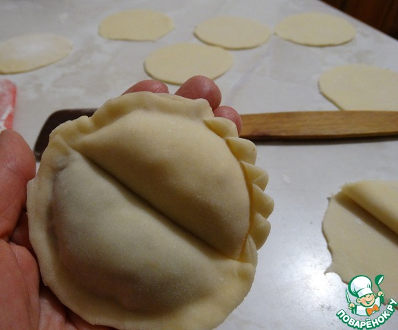 Затем по кругу делаем защипы, с которыми вареник приобретает более эстетичный вид и дополнительную прочность.
