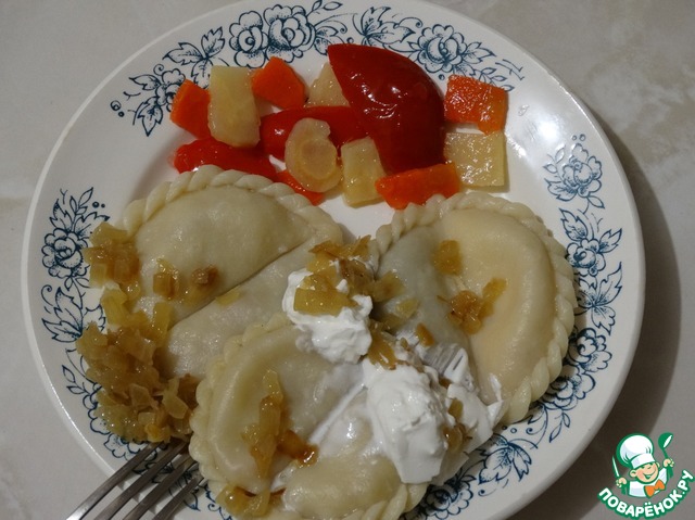 Вареники по 7-10 шт опускаем в кипящую воду, не допуская бурного кипения. Время варки 5 минут после закипания. Сразу выкладываем в порционные тарелки и подаем со сметаной и жаренным луком.