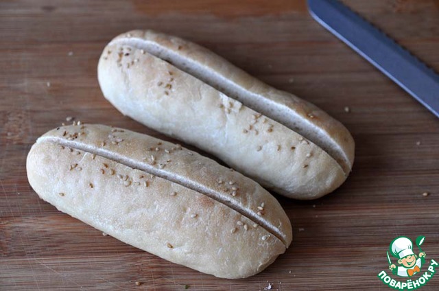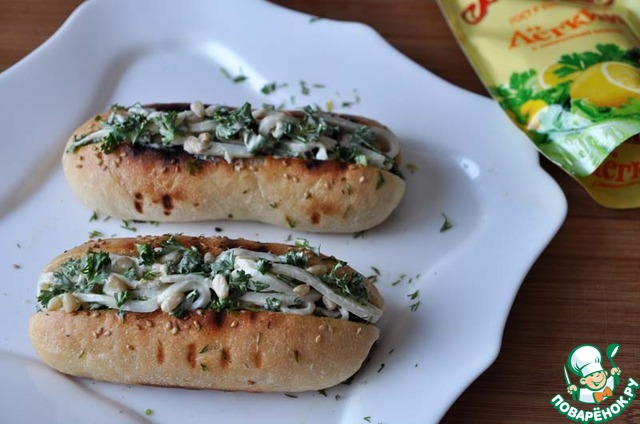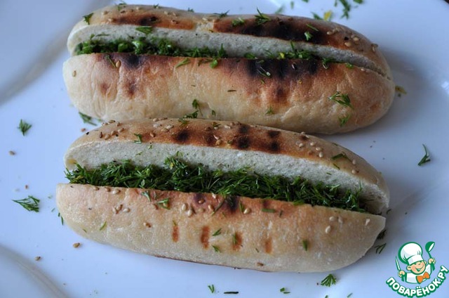 Берём подсушенные булочки, слегка раздвигаем, промазываем внутри всё ароматным маслом с укропом.