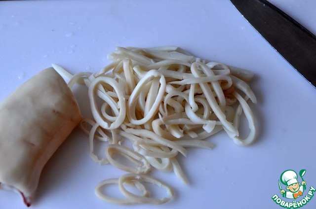Кальмары чистим и опускаем в кипяток на 1 минуту.